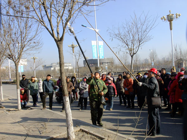 12月23日--27日,市園林局抓緊時(shí)機(jī)對(duì)園林綠化從業(yè)人員進(jìn)行培訓(xùn),他們聘請(qǐng)了具有豐富理論和實(shí)踐經(jīng)驗(yàn)的清華大學(xué)園林專業(yè)的教授,采取理論與實(shí)踐相結(jié)合的培訓(xùn)方式,系統(tǒng)講述了園林樹(shù)木修剪,養(yǎng)護(hù)以及病蟲(chóng)害的防治,來(lái)自我市各縣、市、區(qū)的園林綠化專業(yè)技術(shù)人員130余人參加了此次培訓(xùn)。圖為老師在前進(jìn)大街現(xiàn)場(chǎng)演示大樹(shù)修剪方法。